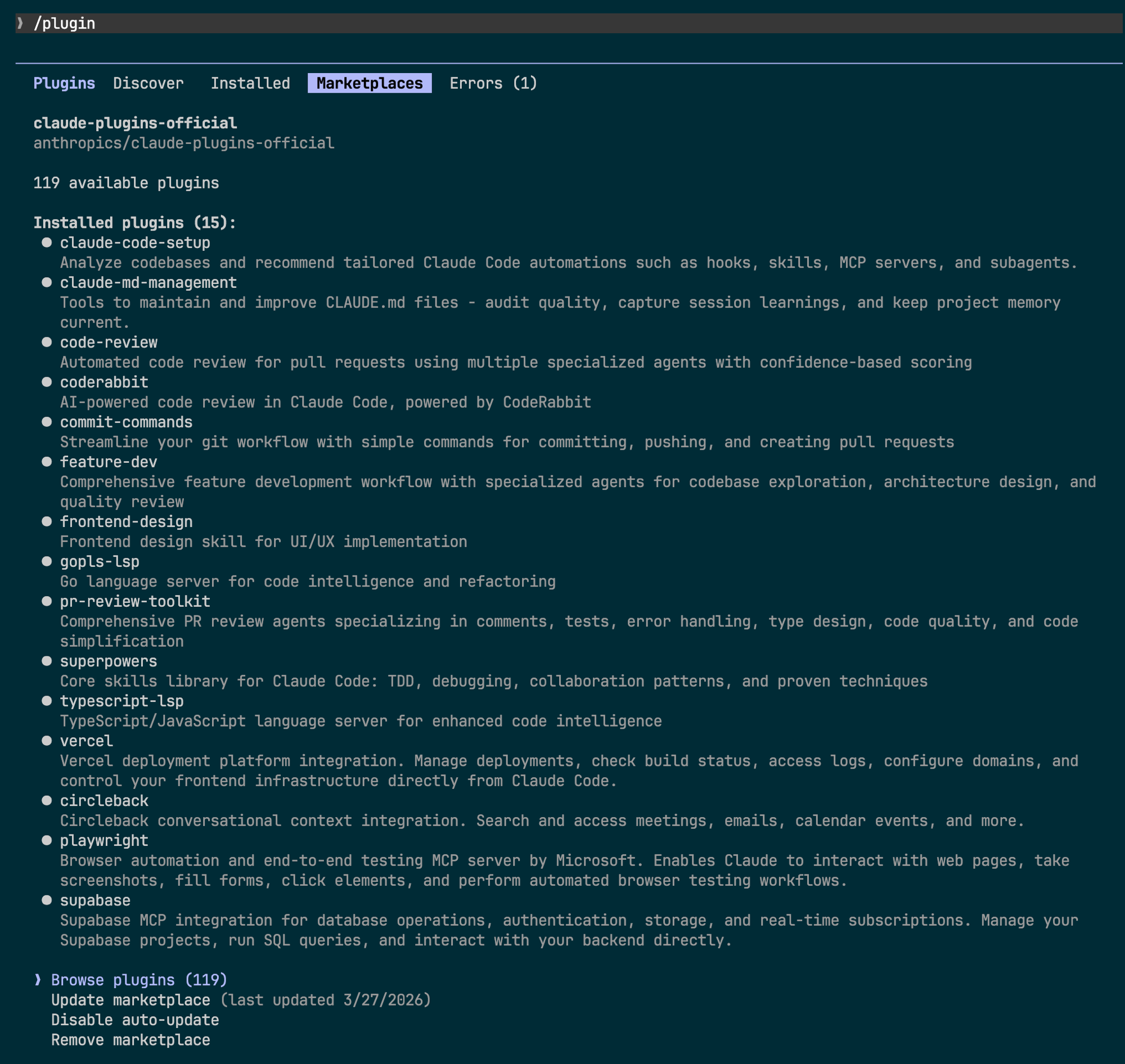 Type /plugin in Claude Code to open the plugin manager. The built-in Marketplace draws from the official Anthropic Skills repo for direct browsing, installation, and management.